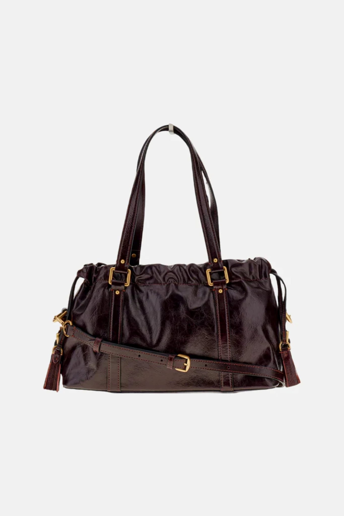 ⇒ Zapięcie na ściągany sznurek tworzy elegancki efekt marszczenia, wzmocniony bocznymi frędzlami, które podkreślają kunszt wykonania.