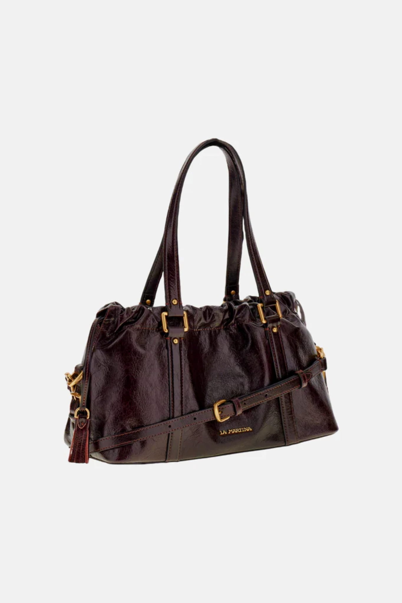 Damska skórzana torebka typu tote marki La Martina, w kolorze bordowym.